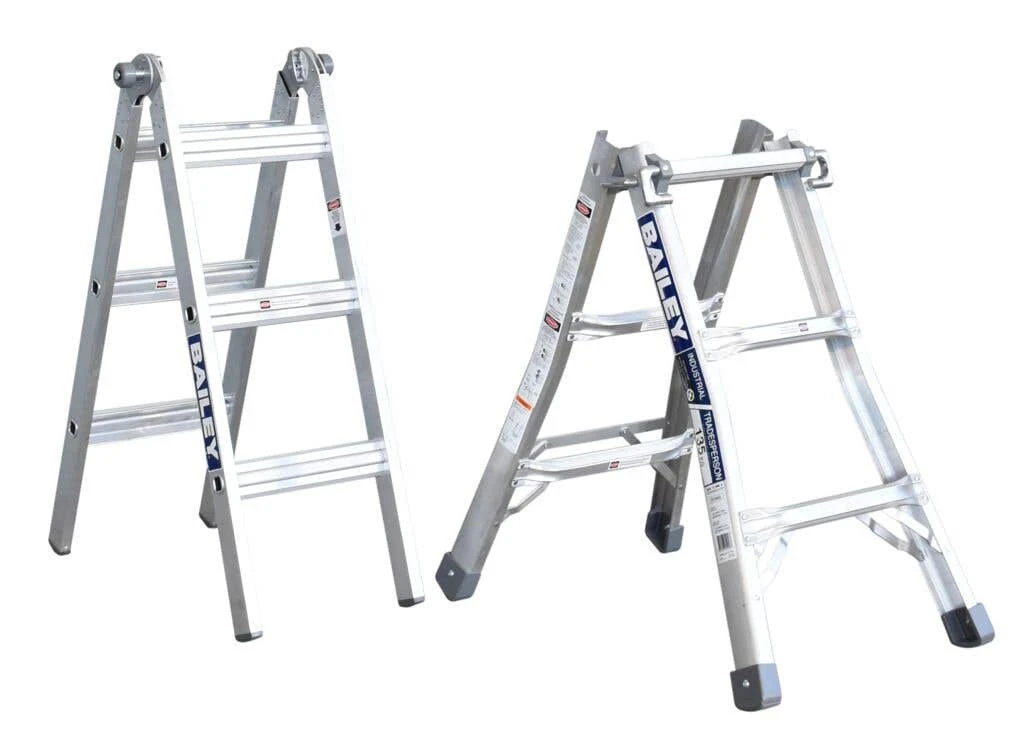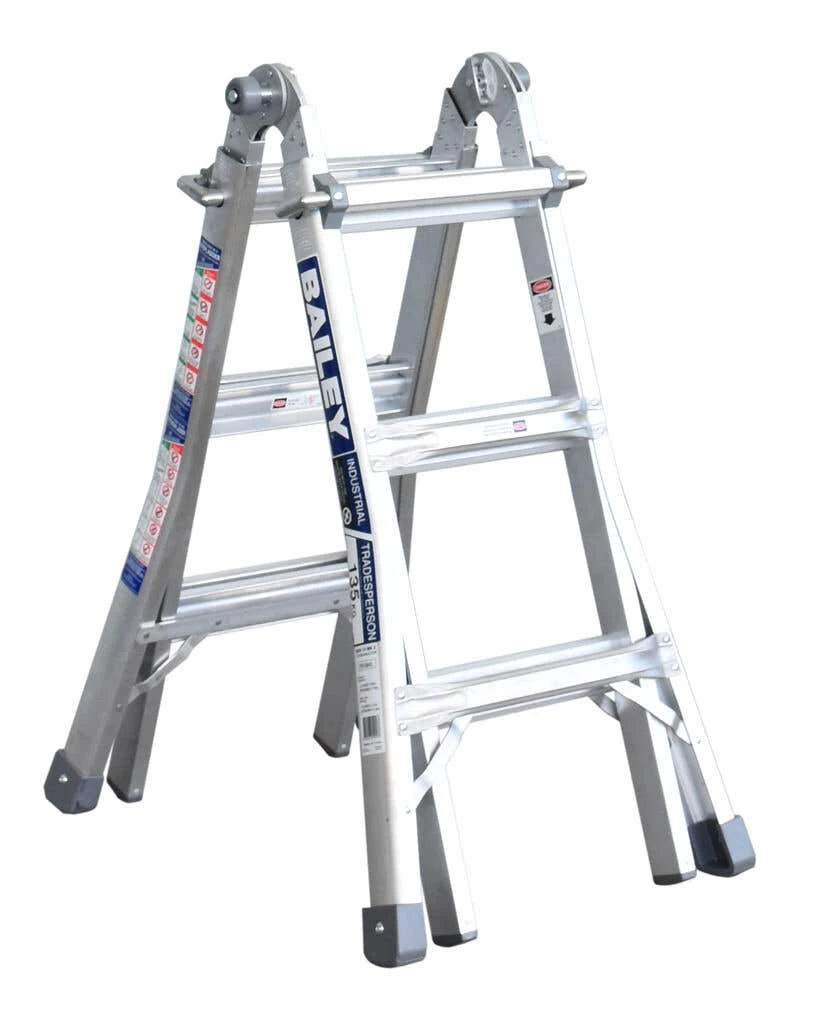 The Bailey BXS13 Multipurpose Ladder combines convenience and versatility with the robustness needed to withstand heavy-duty use and tough industrial conditions. It’s ideal for construction sites, factories and storage facilities, as well as for any tradesperson or ‘er that needs to reach more extreme heights to perform their tasks. This industrial-rated ladder features a strong aluminium construction and has a maximum safe load capacity of up to 135kg. The ladder can be easily converted into four different configurations including a double-sided stepladder, a single-sided straight ladder, a telescopic adjustable ladder and two individual trestles. Its legs are fitted with large anti-slip feet for added stability and protection against slipping.