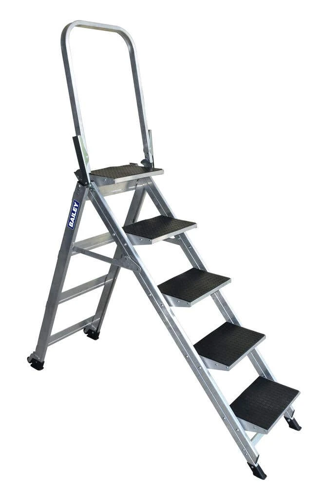 The Bailey FS13753 Aluminium 5-step Stairway Ladder with folding handrail offers safety, stability and strength in a compact ladder solution. The stairway design allows users to walk up and down the ladder with ease with the addition of a folding safety handrail. This product folds to a compact profile for easy storage in confined locations. Ideal for industrial maintenance, aircraft maintenance, facility managers, retail managers, offices, and transport workshops.