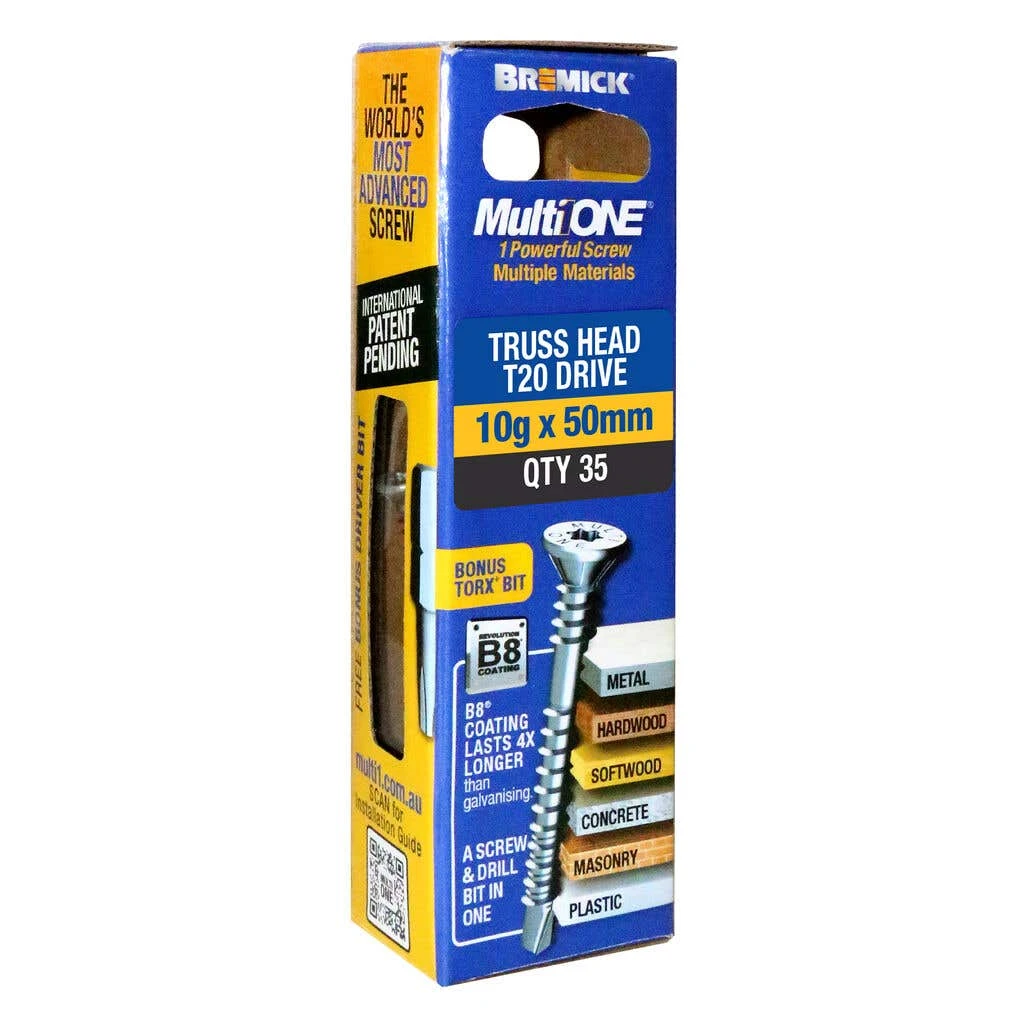 Whatever material, whatever project the MultiONE® does it all! Bremick’s MultiONE® Screw is the world’s most advanced screw, designed to be a screw & drill bit in one! The MultiONE® screw has been designed as a multi-purpose fastener suitable for use in multiple materials. The MultiONE® screw is suitable for use in softwood, hardwood, treated timbers, composite boards, laminated boards, brick, block, concrete, metal, and alloy. Bremick® recommends the use of specialised screws for load critical applications and specialised installations such as roofing. This MultiONE is fitted with a truss head for a more flushed finish. The B8 Coating in this screw lasts 4x longer than galvanizing while also providing 30% faster drilling, 8x the toughness, extreme abrasion resistance, and 2x protection from corrosion vs conventional Class 4 in Category 5 environments.