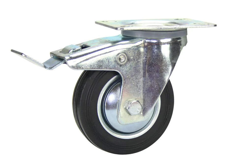 - 100mm heavy-duty black rubber swivel brake castor with plate fitting