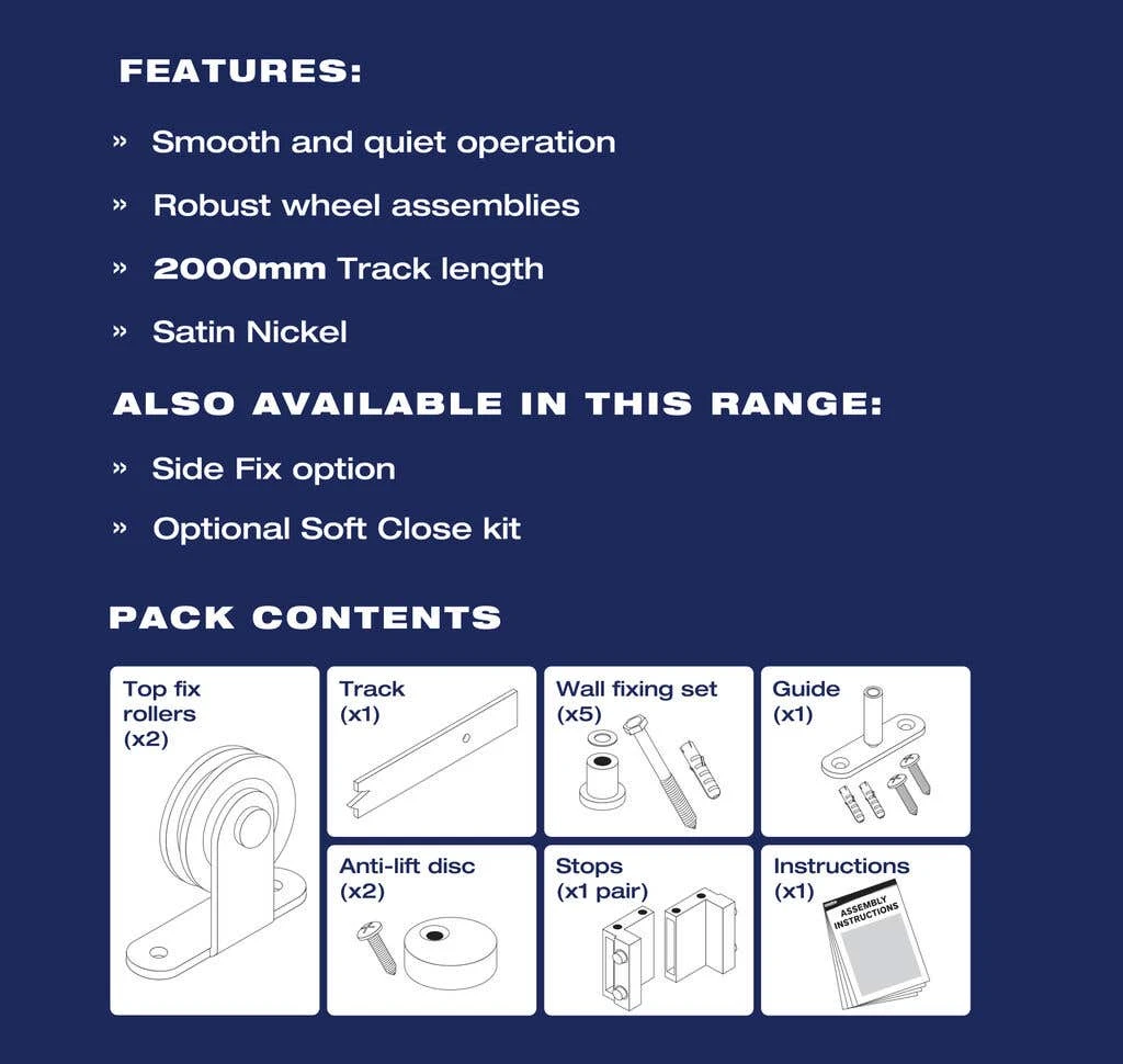 - Top Fix Satin Nickel pre-drilled steel track with wall mount fittings