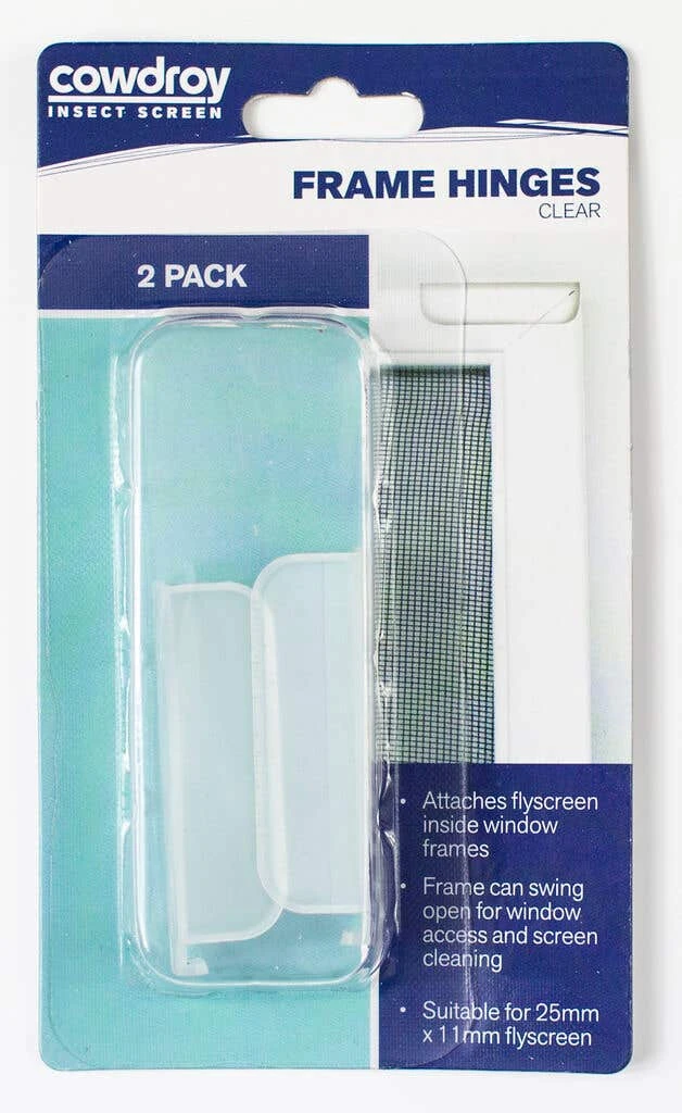 The Cowdroy Hinge Flyscreen Clear Plastic is a great addition to your window screen, allowing you to pop open your window and clean the flyscreen without having to remove it. This hinge allows you to swing open the screen for window access and screen maintenance, making your life much easier when it comes to maintaining your flyscreens. This hinge will fit a 25 x 11mm frame, which is suited for hardy external screens or soft internal screens.