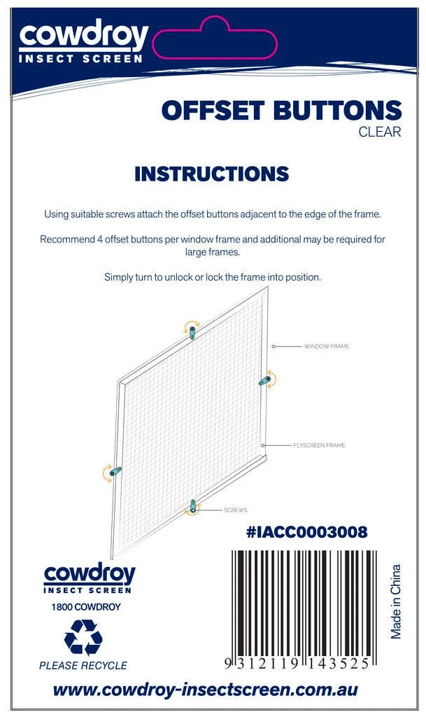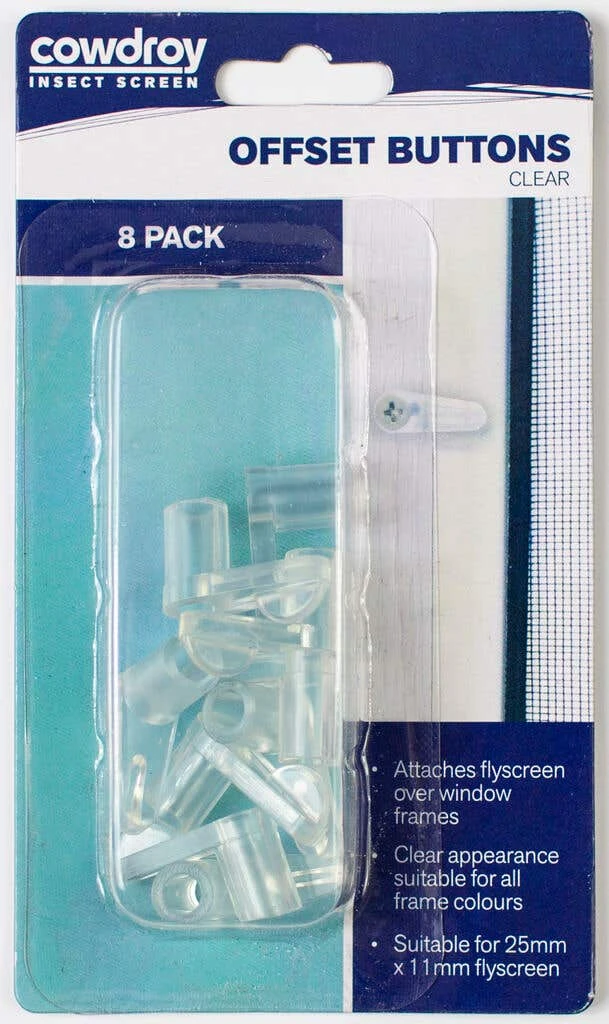 Keep your home cool in the summer and warm in the winter with a simple, effective fly screen. This pack of 8 clear offset buttons for our flyscreen will ensure a snug and secure fit. They are suitable for 25 x 11mm flyscreens and attach over windows to keep out flies, wasps and other insects by covering the gaps around your flyscreen frame. This pack includes all the necessary hardware that is required to install the buttons on your frame.