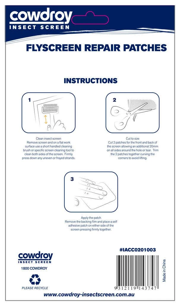 The Cowdroy Flyscreen Repair Patches come in a pack of three and are a quick and easy solution to repairing small holes or tears in your flyscreen. Measuring 100 x 80mm, these patches are suitable for use on most types of flyscreen mesh. The patches are self-adhesive, allowing for easy installation without the need for tools or additional materials. They are also highly durable and long-lasting, ensuring that your flyscreen will remain in top condition for an extended period of time.
