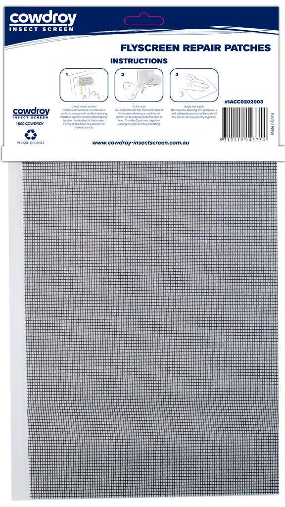 - Value for money. With three patches in each pack, the Cowdroy Flyscreen Repair Patches offer great value for money, providing you with everything you need to repair multiple flyscreens at once