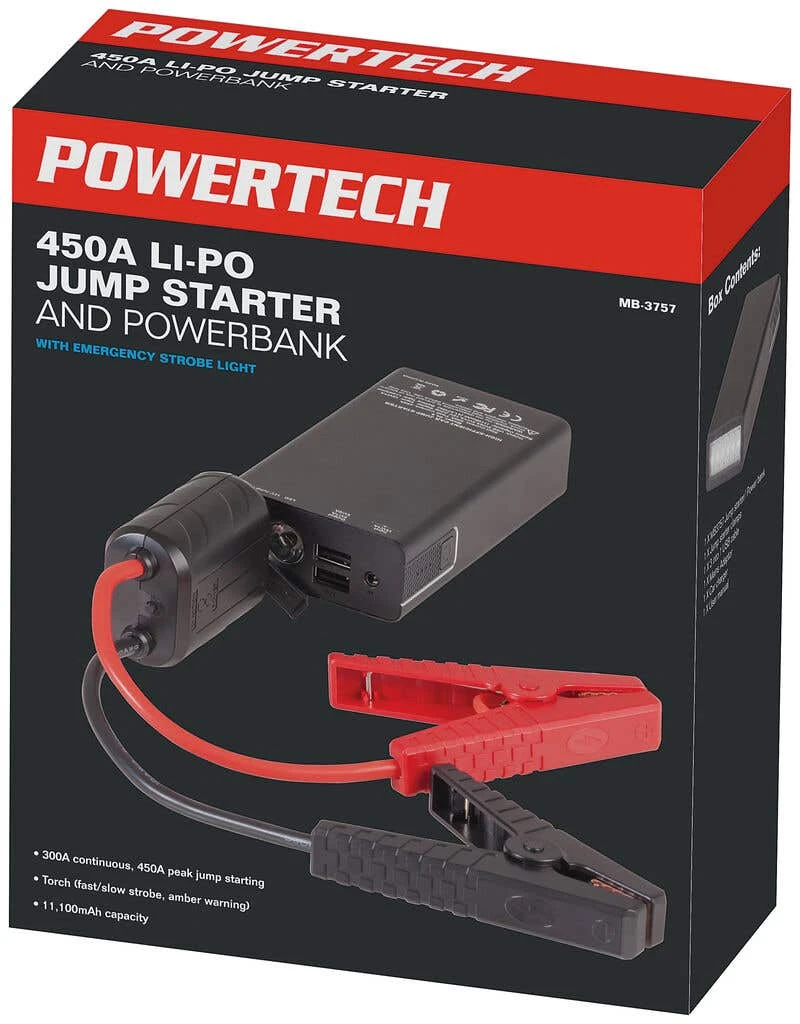 Powerful enough to start most vehicles, it’ll crank an engine up to a 5L petrol, or 3L diesel. When not being used for jumpstarting it includes an LED torch, as well as a strobe/orange warning light. You can charge USB devices using one of the two USB ports, one rated at 1A, the other at 2A. Recharge time is less than 5hrs, recharged using the supplied mains adaptor. Never leave home without it!