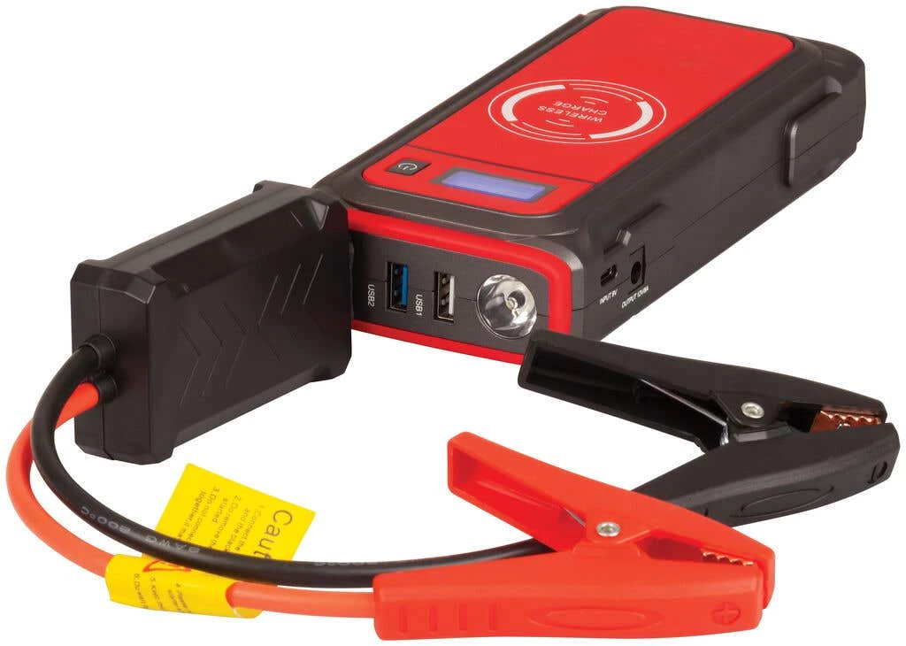 It wasn’t long ago that so called “portable” jump starters were about as portable as 4 bricks with a handle on top. Things have changed a lot since then thanks to lithium technology. Indeed, this unit weighs in at around half a kilogram and could almost fit inside a shirt pocket! Not only is it light and portable with a whopping 850A cranking current, it also features a wireless Qi charger for your phone and two USB sockets for your other devices. You won’t be caught in the dark either thanks to the built in torch with SOS beacon function. Charging is via the onboard USB C socket.