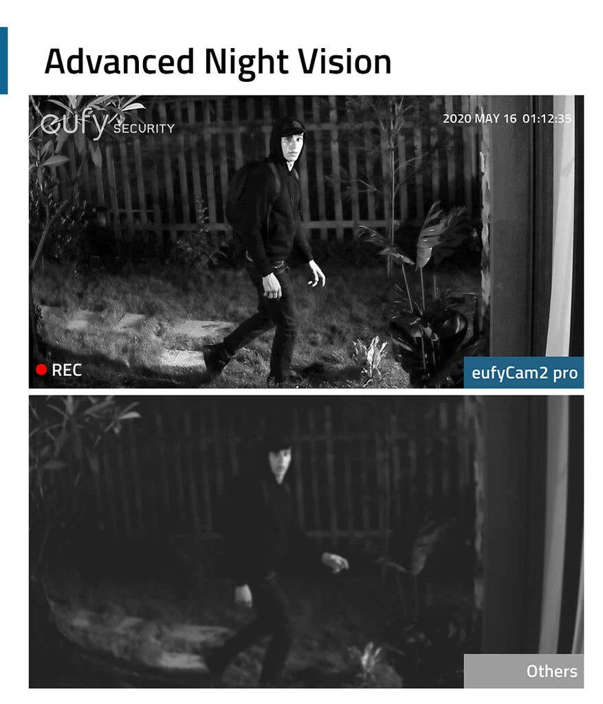 Every Security product is engineered to ensure your security data is kept private. Have peace of mind that you will have a secure record of everything that happens around your home. Without cords or wires of any kind, eufyCam 2 Pro installs indoors and out with ease to surveil your home for 365 days on a single charge. Get a clearer, brighter view of the people in shot. Built-in AI technology identifies and focuses in on the human in the image. Reduce false alerts with smart tech which differentiates humans from objects. Notifies you in seconds when suspicious motions are detected. Only receive the alerts that matter. Customize the area in which detection takes place to suit your home. Speak directly to anyone who approaches your home via two-way audio. Connect your devices to Apple HomeKit, Google Assistant or Amazon Alexa for complete control over your surveillance. Encrypted data and footage can only be accessed by logging into the account.