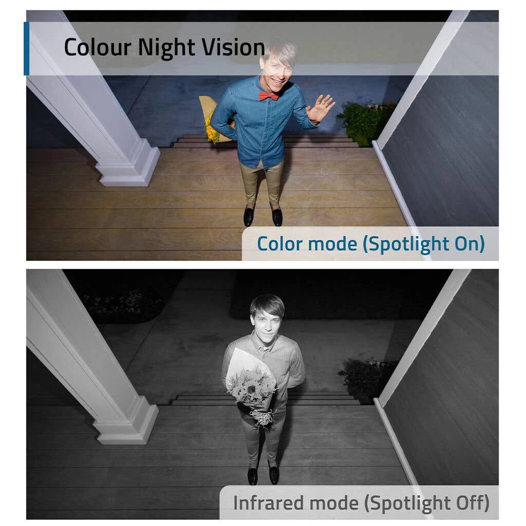 - Detailed Night Vision: View recordings or live footage in crisp clarity, even at night, for a clear view of who’s there. The built-in spotlight illuminates the surrounding area and allows you to see the whole picture in colour clarity, even in low light. An infrared setting also available
