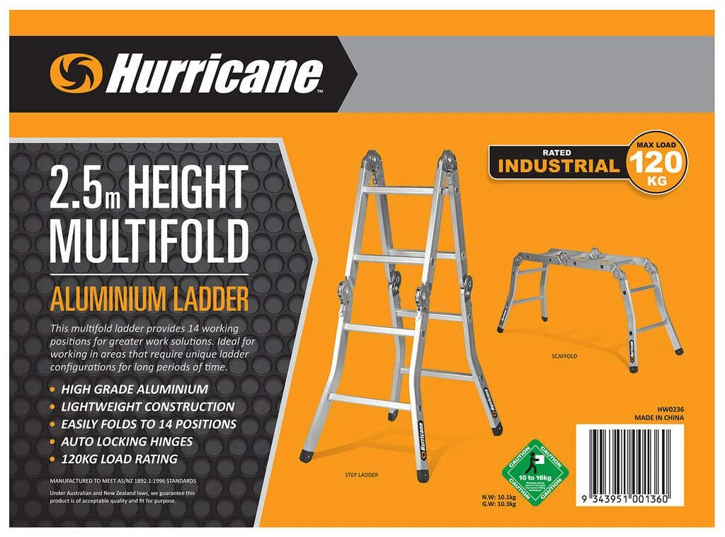 Offering 14 working position options, the Hurricane™ 2.5m Multifold Ladder delivers convenient solutions to any work task. This ladder is industrial rated to a max load of 120kg and is ideal for jobs which required a number of unique ladder configurations. It is made from high grade aluminium and has a lightweight construction which makes it easy to transport. This ladder easily folds into 14 positions including a step ladder, a 2.5m straight ladder and a scaffold ladder, making it a fantastic option for trades. It has auto locking hinges which provide added security and safety while in use. This ladder is manufactured to meet AS 1892.1 standards and is compact for easy storage and transport as needed.