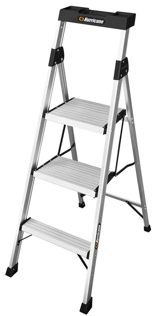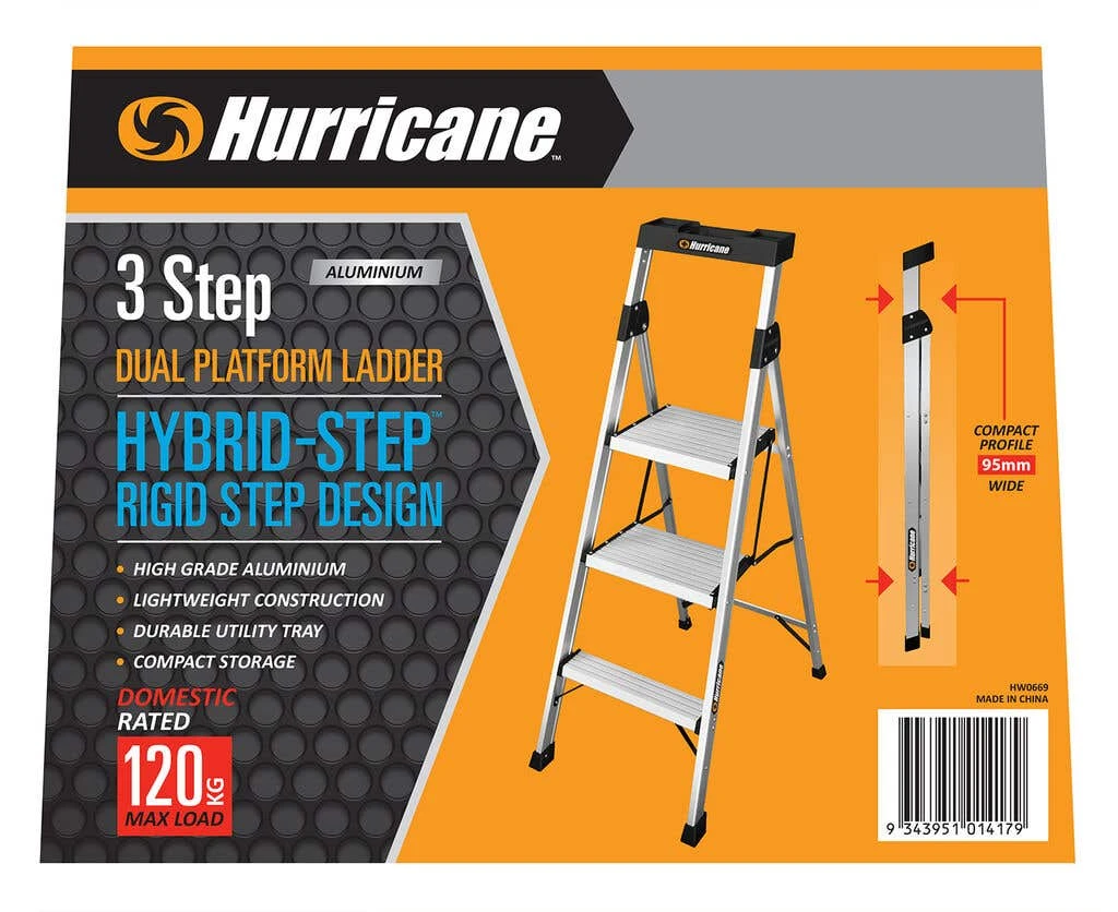 The Hurricane™ 3 Step Dual Platform Ladder is a domestic-use ladder with sturdy aluminium construction and non-slip feet, which ensures safety and stability while in use. It has a wide platform and rigid step design which both provide added stability, allowing you to complete your projects at home with added reassurance. This ladder has a lightweight aluminium construction which means it is easy to carry around your home, plus it has a compact profile which measures just 95mm when folded, meaning it will not take up too much storage space in your , garage or backyard. Equipped with a durable utility tray to hold small tools, parts, and paint cans, this ladder helps you keep your hands free while working. With a 120kg max load, this 3 step ladder is great for any DIY job.
