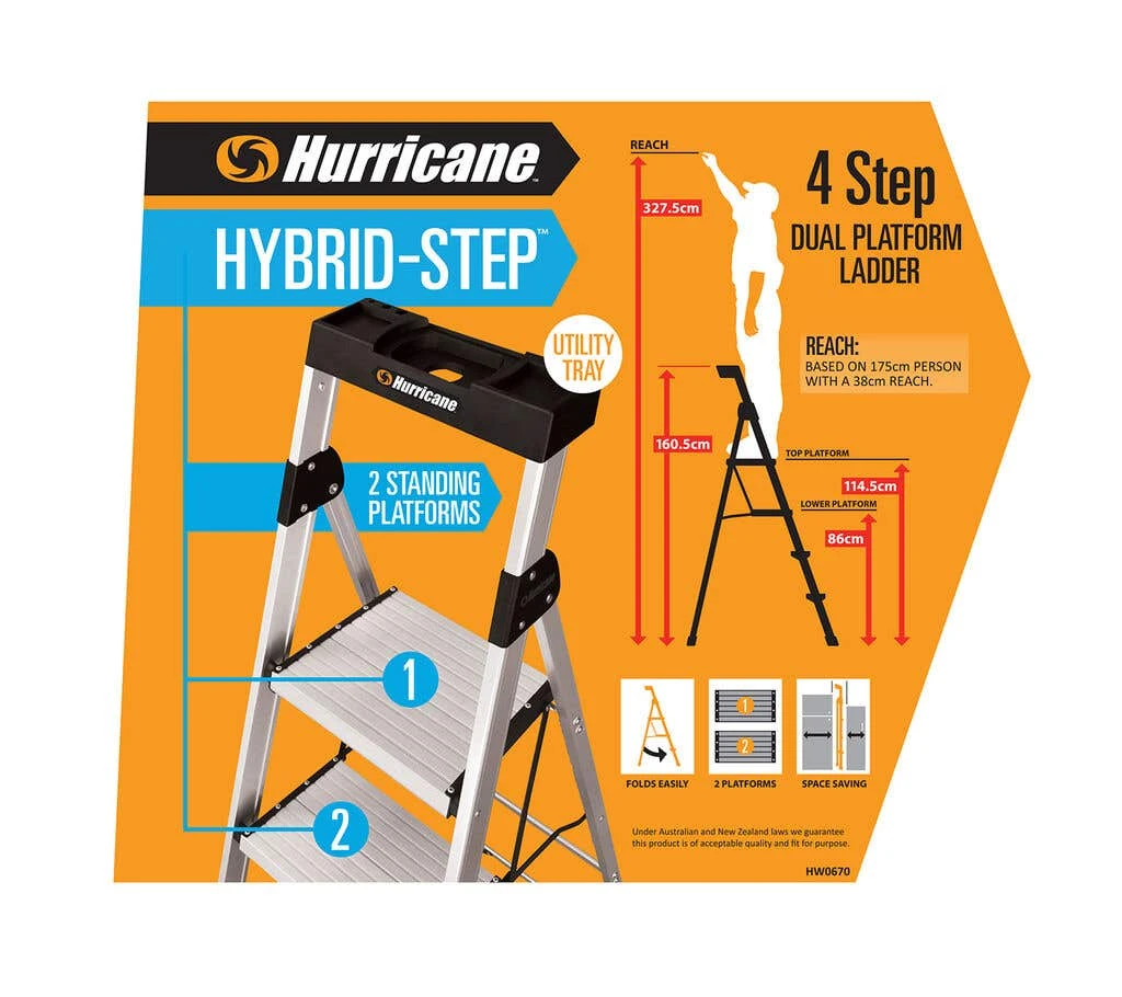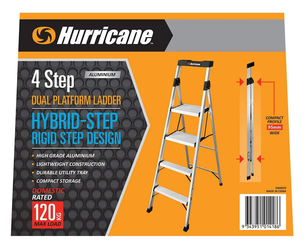 The Hurricane™ 4 Step Dual Platform Ladder is a domestic-use ladder with sturdy aluminium construction and non-slip feet, which ensures safety and stability while in use. It has a wide platform and rigid step design which both provide added stability, allowing you to complete your projects at home with added reassurance. This ladder has a lightweight aluminium construction which means it is easy to carry around your home, plus it has a compact profile which measures just 95mm when folded, meaning it will not take up too much storage space in your , garage or backyard. Equipped with a durable utility tray to hold small tools, parts, and paint cans, this ladder helps you keep your hands free while working. With a 120kg max load, this 4 step ladder is great for any DIY job.