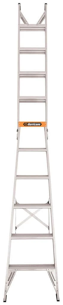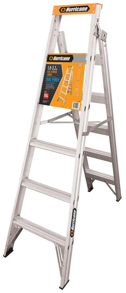 The Hurricane™ Dual Punch™ 1.8 – 3.2m Dual Purpose Ladder is an industrial-use ladder with a sturdy aluminium construction and non-slip feet, which ensures safety and extra stability when in use. Its lightweight aluminium construction makes it easy to transport, yet still stable enough to achieve a 150kg load rating. This ladder can be used as a straight ladder or an ‘A’ frame, allowing you to reach the correct height for each job. The ladder measures 1.8m tall in ‘A’ frame configuration and 3.2m as a straight ladder. The Dual Punch™ rigid tread design ensure anti slip surface so you won’t have to worry about your safety, allowing you to focus on completing whichever task you have more efficiently. Manufactured to meet AS 1892.1 standards, this ladder is suitable for a range of tasks on the jobsite.