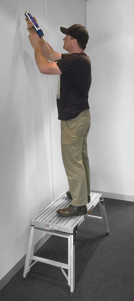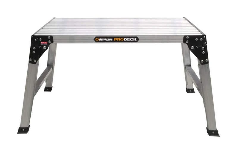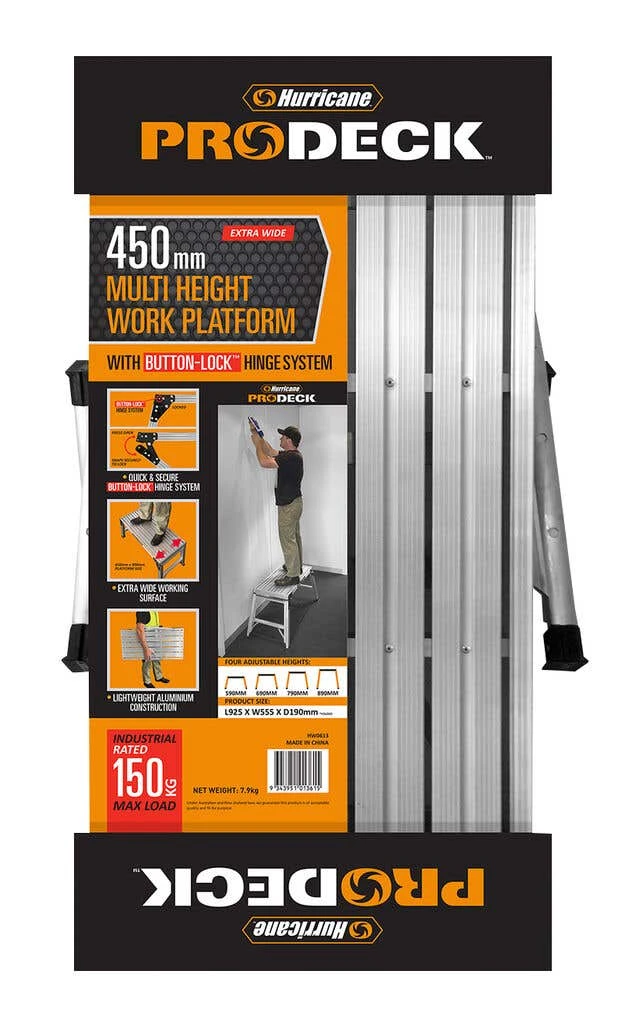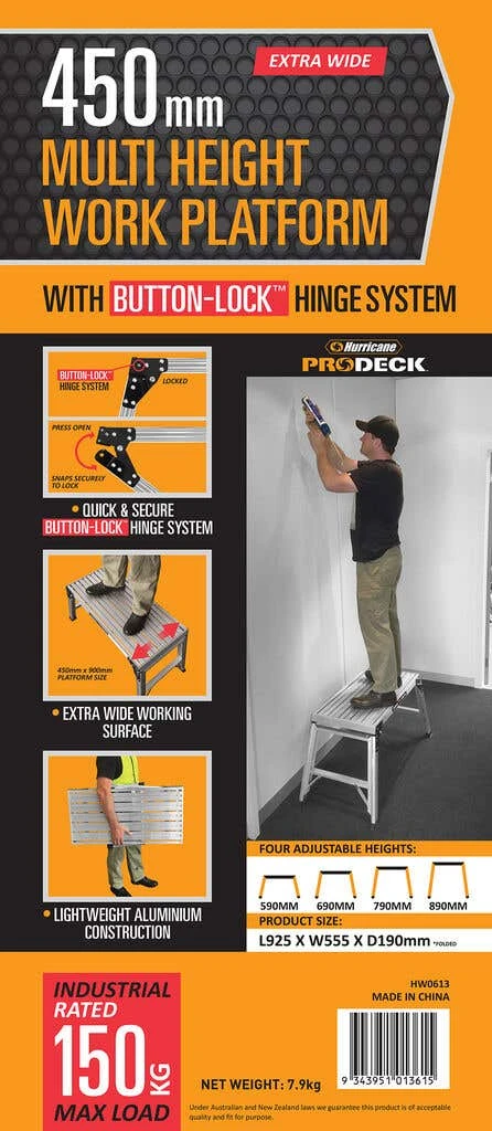 The Hurricane™ Multi Height Work Platform is a W450 x L900mm working platform with four adjustable heights of 590mm, 690mm, 790mm and 890mm. It has a lightweight aluminium construction which means it is easy to carry around the jobsite for a range of tasks. Use it to reach lower heights which do not require a ladder, keep your tools safe off the ground or for a range of other projects on the jobsite. This work platform has a 150kg load rating and is industrial rated. It is designed with a unique Button-Lock™ hinge system which snaps securely to lock to ensure safety when in use. With an extra wide working surface, this work platform is comfortable to stand on and provides sufficient space as a portable workbench.