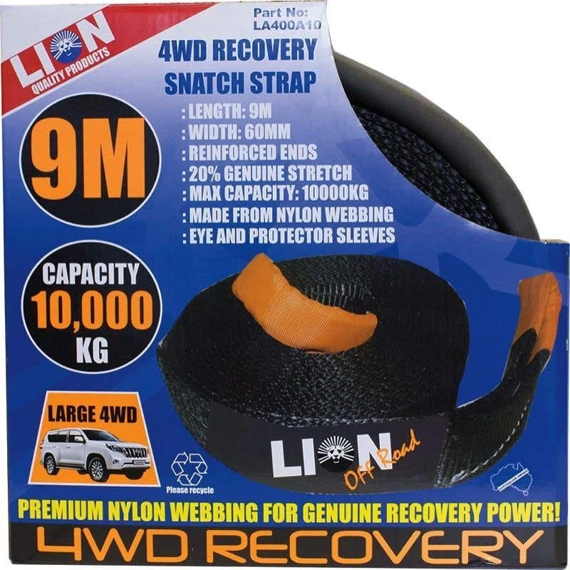 This Lion 4WD Recovery Snatch Strap is a high-quality 9m x 60mm snatch strap with a 10,000kg capacity and can be used for vehicle recovery. This strong snap hook recovery strap is made from premium nylon webbing with 20% genuine stretch and recovery ability, perfect for 4WDs, cars, and trucks, on the work site or around the farm. The heavy-duty anchor eyes are reinforced for extra strength and have protective sleeves to reduce wear and tear.