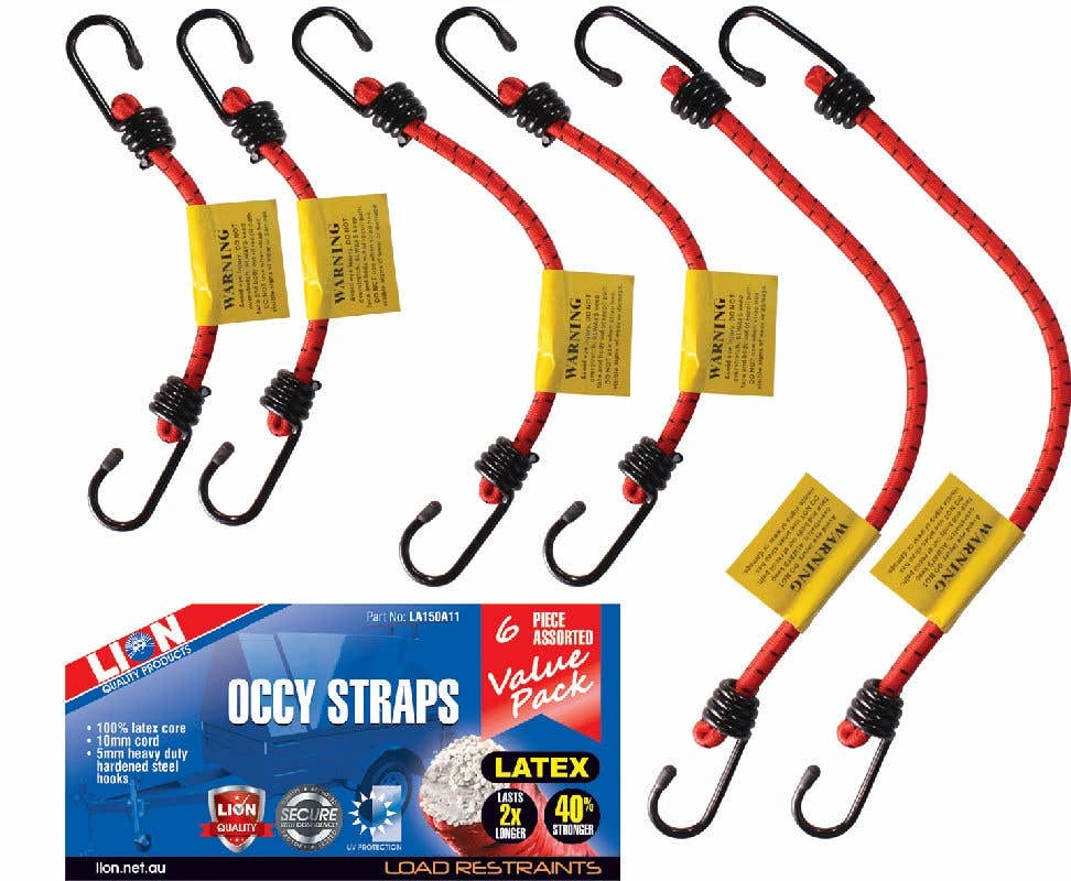 6pce octopus strap assortment, 2×12″ 2×18″ 2×24″ 10mm multi strand elastic strap with extra strength vinyl coated hooks.
