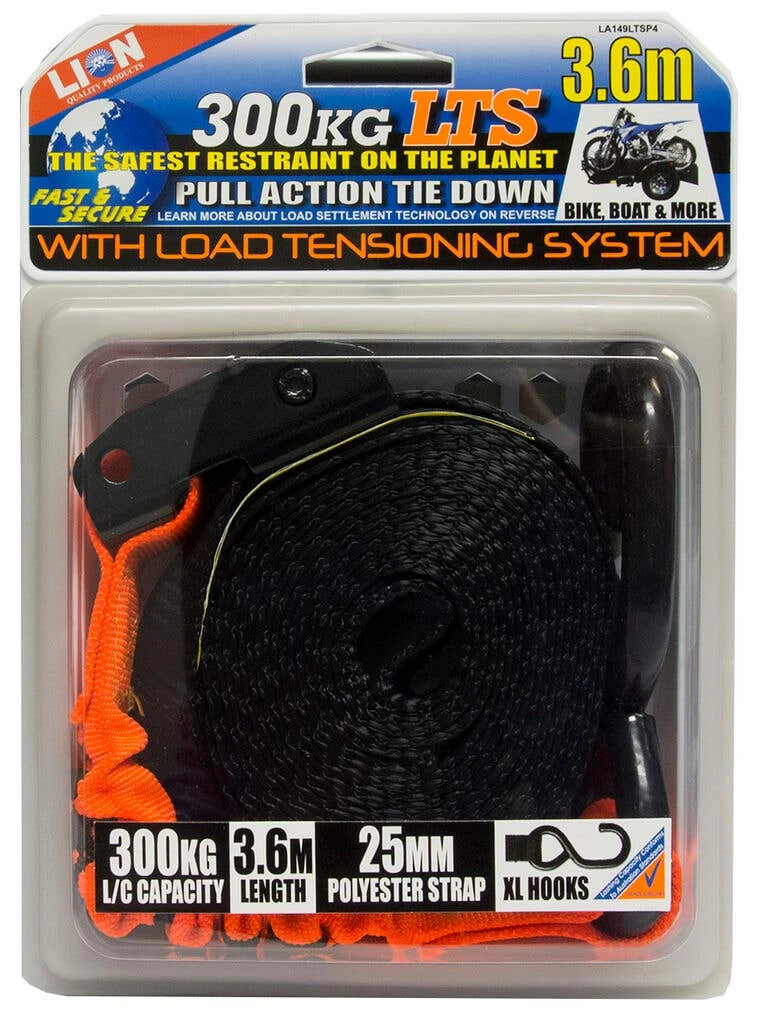 The Lion LTS Pull Tie Down 25mm x 3.6m is a durable and versatile accessory designed to secure items during transportation or storage. This high-quality tie-down strap is perfect for safely fastening cargo, luggage, or equipment, ensuring they stay in place even during bumpy rides or rough conditions.