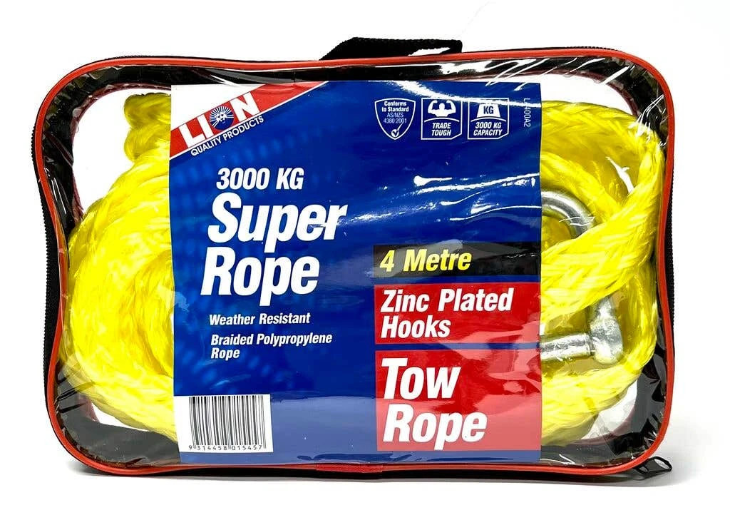The Lion Super Rope is great for your towing needs. The braided polypropylene rope itself is weather resistant and comes with zinc plated hooks which means you can use this even in bad weather conditions and is strong enough to pull 3000kg. It is also equipped with D-Shackle on its end to easily attach to attach to your stuff.
