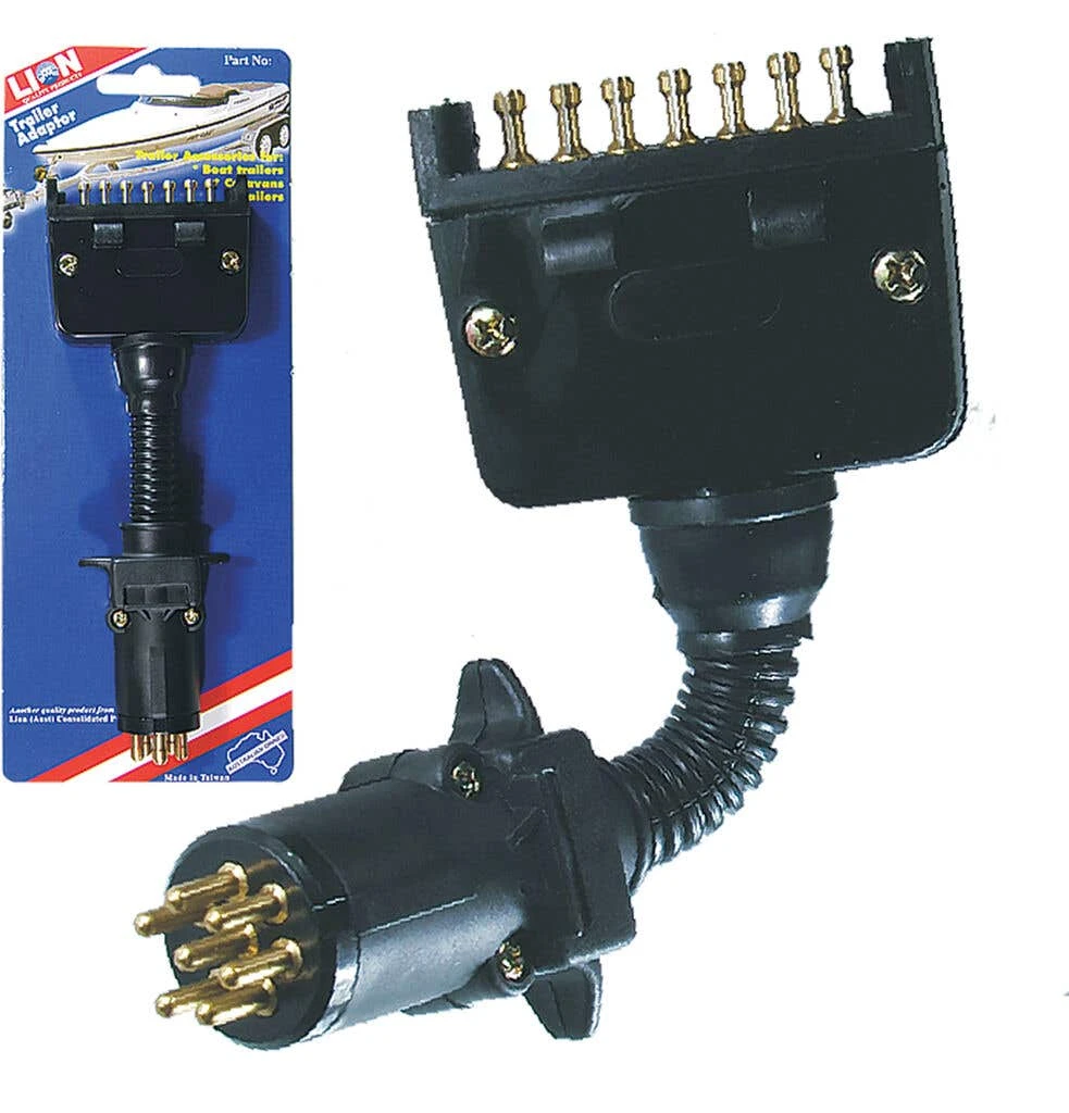 The Lion Trailer Adaptor provides a 7-pin flat plug to fit in a car and 7 pin round base to accommodate 7 pin plugs on recreational vehicles such as caravans, boats and trailers. This Adapter allows access from standard Australian power outlets