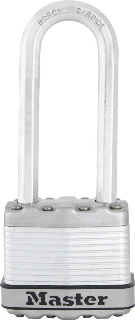The Master Lock Excell No. M1DLJ Laminated Padlock features a 45mm wide laminated steel body for maximum strength and reliability and is surrounded by stainless steel and zinc outer components for weather resistance. The 8mm diameter octagonal shackle is 64mm long and made of Tough-Cut boron-carbide, 50% harder than hardened steel, offering maximum resistance to cutting and sawing. The 4-pin cylinder prevents picking and the dual-locking ball bearings provide maximum resistance against prying and hammering. The Limited Lifetime Warranty provides peace of mind from a brand you can trust.