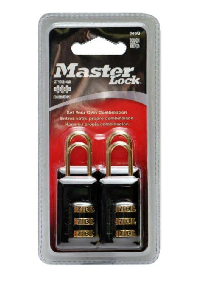 The Master Lock Combination Padlock is an easy-to-use, durable lock that has a 20mm wide solid metal body with a black finish and features a steel shackle for cut resistance. This 4 Pack of locks includes pre-drilled holes and mounting hardware. Set your own unique combination while still having that peace of mind that comes with the Limited Lifetime Warranty.