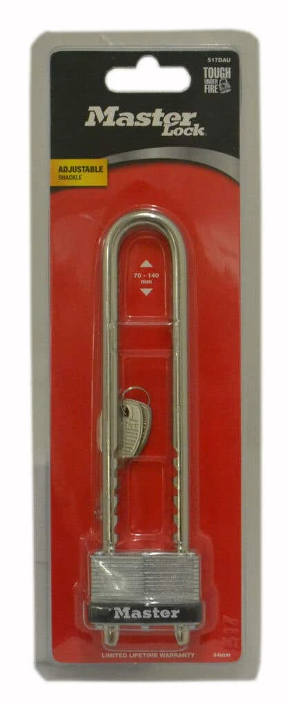 Master Lock Laminated Adjustable Padlock has a 44mm wide laminated steel body for strength and reliability. The 7mm diameter shackle can be adjusted from 7cm to 14cm long for application flexibility. This product is made of steel, offering strong resistance to cutting. The warded single-locking lever mechanism minimizes jamming from dirt and grime. There is also a Limited Lifetime Warranty available, providing peace of mind from a brand you can trust.