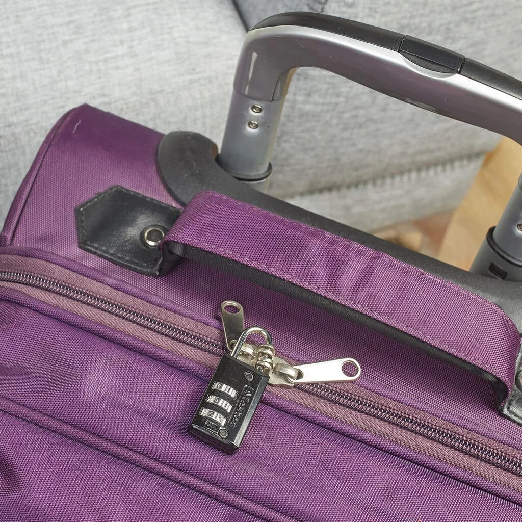 This luggage lock features a 20mm wide metal body for durability and a 3mm diameter steel shackle for strong cut resistance that fits most luggage zips. The locking mechanism features steel-plated dialling wheels and a black vinyl cover.