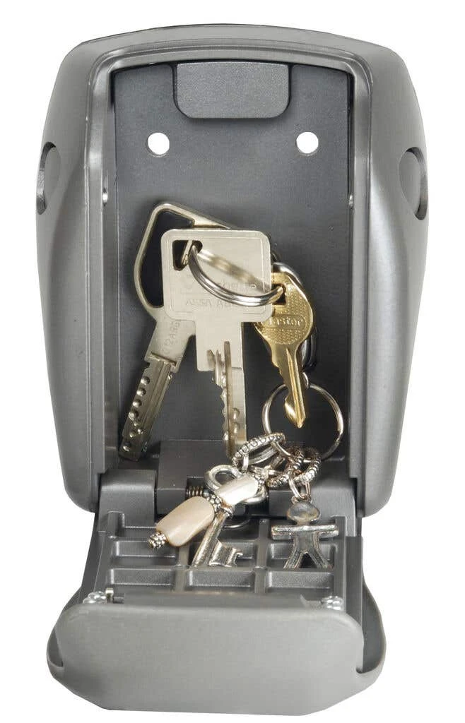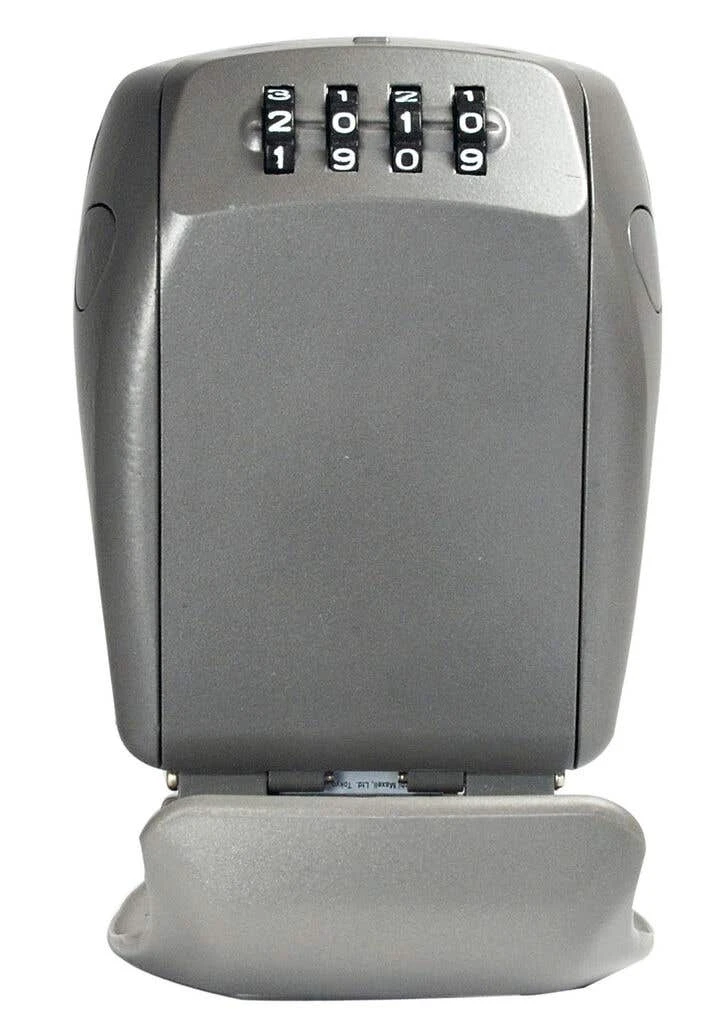This wall-mount key safe is easy to install and convenient to use, offering an efficient way to lock up your keys, or cards. This safe is constructed from solid zinc and comes with dual locking levers for more secure closure. It is also plated in rubber and plastic for greater weather resistance.