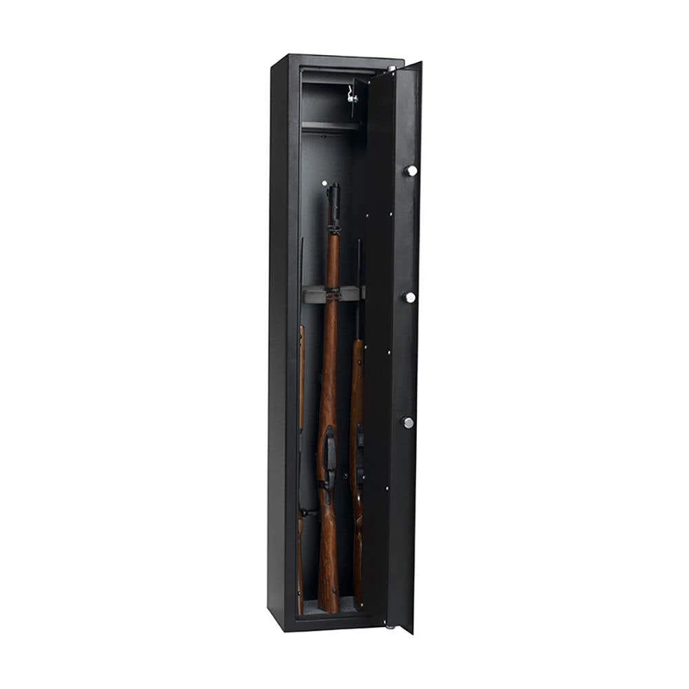 This Steel Gun Safe from Safewell stores up to 4 rifles/shotguns.