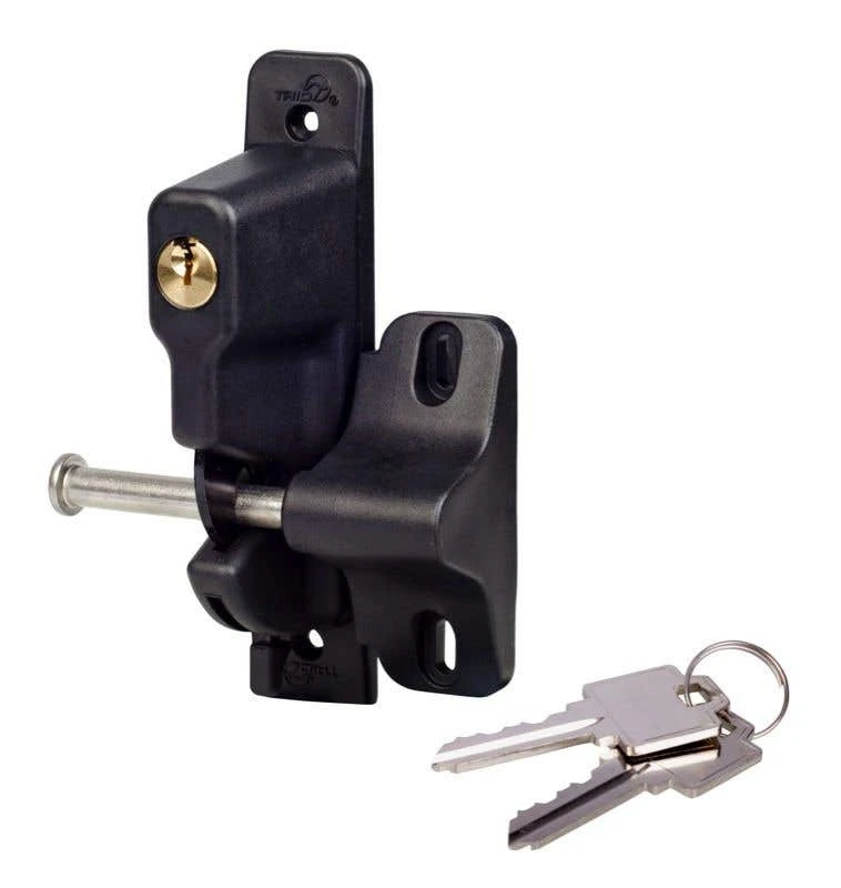 The SafeAZ Gravity Single Gate Latch by Trio is a great option for controlling access to your home or business and keeping children and pets safe. The black nylon handle can be installed on either left or right-hand sides. Features corrosion-resistant metal teeth and polymer that increases abrasion resistance and tensile strength. It comes with a 5-pin rekeyable lock suitable for right and left-handed applications.