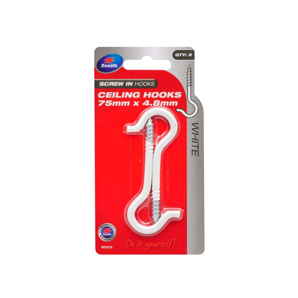 Zenith Ceiling Hooks are a heavy duty hook ideal for hanging medium to heavy items. These hooks have two sections: a curved hook section followed by a threaded component designed to hold into timber. In most applications ceiling hooks can be screwed in by hand, in some instances pre-drilling is required.